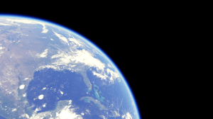 Earth model rendered using a real-time ray tracing fragment shader written in Cg/HLSL and displayed in a Unity frame capture. The parameters affecting aerial perspective are set to medium values.