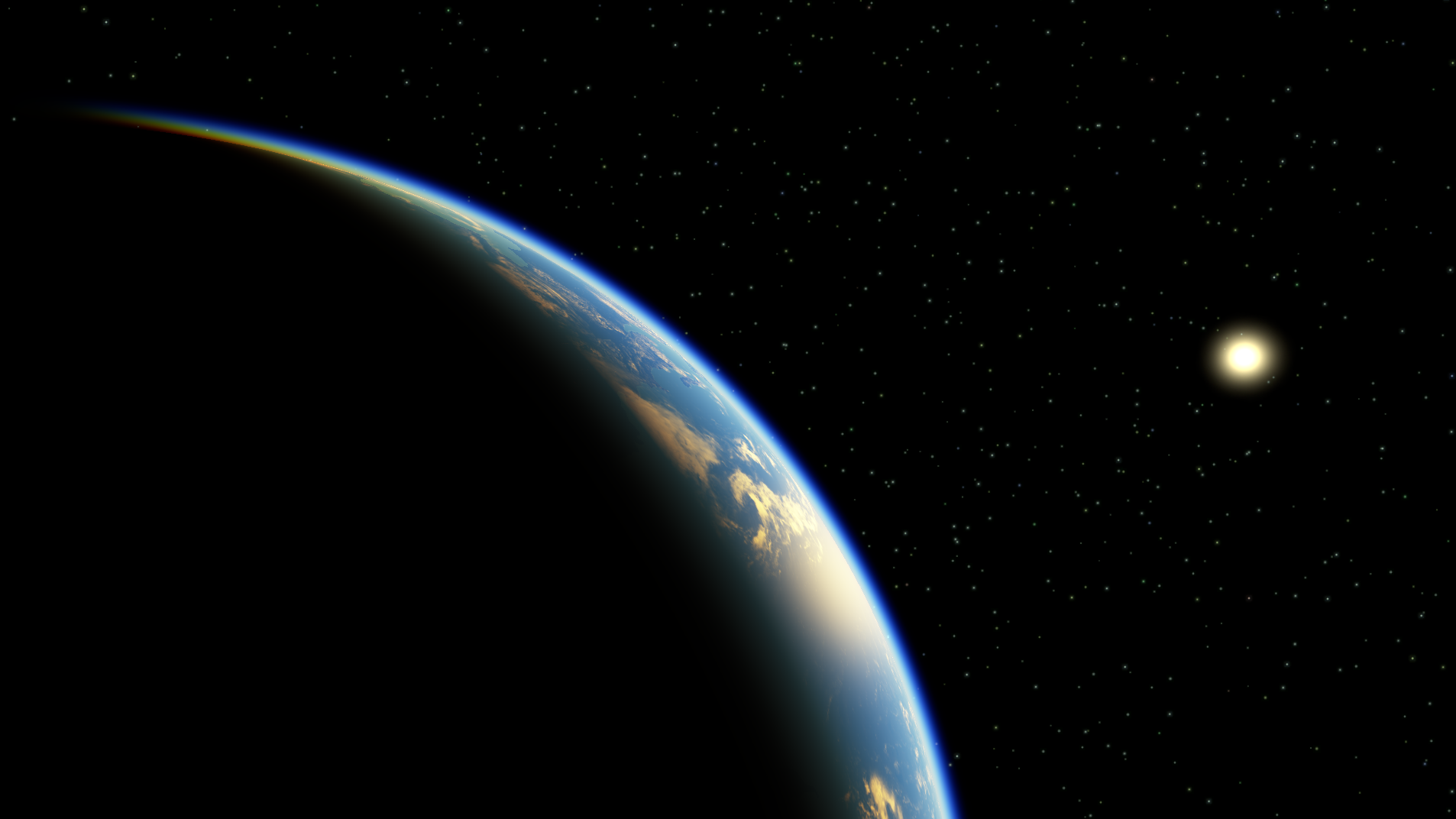 Earth model rendered using a real-time ray tracing fragment shader written in Cg/HLSL and displayed in a Unity frame capture. This image is morning.